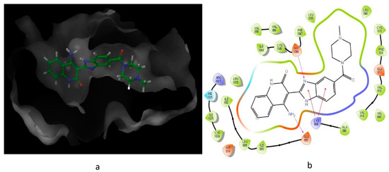 Predicted interaction of paclitaxel with microtubule active site residue [88,89]. (a) 3D structural view of the sulfonamide ligand inside the receptor’s active site. (b) Ligand interaction diagram; violet lines represent hydrogen bonds and green lines represent π–π interactions.