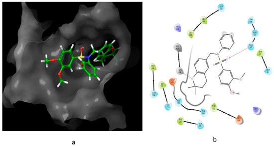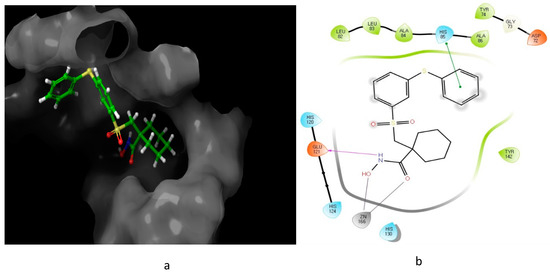 Predicted interaction of α-sulfone (12) derivative active site residues of matrix metalloproteinase (MMP) [51,52]. (a) 3D structural view of ligand inside the receptor’s active site. (b) Ligand interaction diagram; violet lines represent hydrogen bonds and green lines and grey line represent metal interactions.