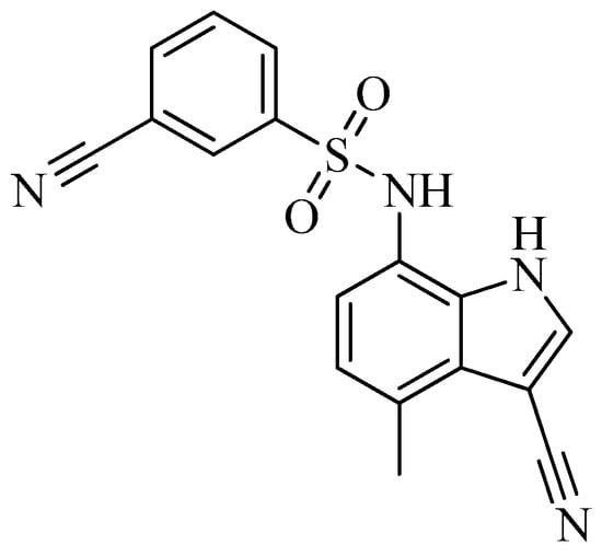 As of today, there are no FDA-approved heterocyclic sulfonamide anti-angiogenics in the market, but there are several promising leads being developed. One of such leads is E7820, which is now in phase II clinical trial for colorectal cancer treatment through the inhibition of integrin α2 [59]. Integrins are transmembrane receptors that are central to the biology of many human pathologies, where they act through the mediation of the cell-extracellular matrix and cell–cell interaction [60]. This mediative action is carried out through the transduction of information from the extracellular environment to modulate cell responses, together with adhesion, spreading, migration, growth signaling, survival signaling, secretion of proteases, and invasion [3,61,62]. Numerous studies report that the increased levels of integrin α2 facilitate the spread of cancer [63,64,65,66]. Thus, inhibitors of integrin α2, such as that shown in Figure 6, will slow the spread of cancer and its metastasis.