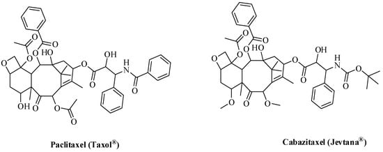 Throughout mitosis, normal cells could arrest owing to interference in the dynamic properties of microtubules, where microtubules continuously polymerize and rapidly depolymerize, making a ‘pulling device’ for the duplicated chromosomes [81]. MTAs (microtubule-targeting agents) act through the stabilization of microtubules against depolymerization [82,83,84]. One of the most promising microtubule targeting agents is paclitaxel. In a study conducted by Ganesh et al., the cytotoxicity of some paclitaxel derivatives was measured as illustrated in Table 4 [85].
