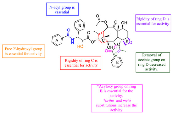 From the study of Ganesh et al., it was found that any changes to rings C and D led to loss of activity, indicating the importance of their structural rigidity. The following groups were found to be essential for activity: the N-acyl group, the free 2′-hydroxy group, and the acyloxy group substitution on ring E. In addition, the ortho and meta substitutions on ring E increased the activity. On the other hand, when the acetate group on ring D was removed, the activity decreased significantly. The SAR of the above-mentioned paclitaxel analogues is illustrated in Figure 10.