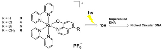 Molecular tuning with ligand exchange for [Ru(bpy)3]2+ was applied to the 8-quinolinol ligand for DNA photocleavage (Figure 2). Zhou and Wang synthesized [Ru(bpy)2(R-OQN)]+ (R-OQN = 5-chloro-8-oxyquinolate or 5-bromo-8-oxyquinolate) complexes, which could generate hydroxyl radicals and cleave DNA when irradiated with visible light [31]. The unique property of the 8-quinolinol ligand allowed for the high reducing ability and the generation of superoxide anions and hydroxyl radicals. In addition, the halogen effect on these non-innocent ligands was investigated. The 5-chloro- (4) and 5-bromo-substituted ligands (5) showed greater efficiency than the non-substituted 8-quinolinol (3) and 5-methyl-substituted ligands (6). With halogen-substituted [Ru(bpy)2(R-OQN)]+, metal-to-ligand charge transfer (MLCT) absorption was obtained at a maximum of 502–508 nm and could be considered a novel agent for photodynamic therapy (PDT) owing to its ability to absorb light at this wavelength.