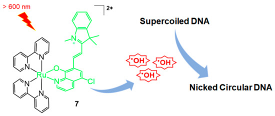 One year later, the same group reported enhanced Ru-bpy complexes for DNA photocleavage, which was based on the generation of hydroxyl radicals [32]. Using the 5-chloro-8-quinolate system, a merocyanine-functionalized ruthenium complex, [Ru(bpy)2(Cl-7-IVQ)]2+ (7, Cl-7-IVQ = 5-chloro-7-(2-(1,3,3-trimethyl-3H-indol-1-ium-2-yl)vinyl)quinolin-8-olate), was obtained and its DNA photocleavage ability under visible light irradiation was investigated (Figure 3). The highest efficiency was observed when the merocyanine group was introduced at the 7-position of quinolinol. Direct functionalization of the merocyanine group without the halogen moiety resulted in a compound with lower reactivity than that exhibited by [Ru(bpy)2(Cl-7-IVQ)]2+. Although the previous 5-chloro-8-quinolate-based [Ru(bpy)2(R-OQN)]+ showed the MLCT absorption maxima at wavelengths shorter than 550 nm, the present merocyanine system has intense adsorption in the 600–700 nm window. Moreover, the efficiency of hydroxyl radical generation was also increased for DNA photocleavage. Studies show that under red light irradiation, [Ru(bpy)2(Cl-7-IVQ)]2+ could selectively inactivate Escherichia coli bacterial cells over HeLa cells.