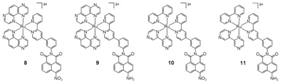 In 2020, Elmes, Quinn, and Gunnlaugsson reported other modified Ru-bpy complexes for efficient DNA photocleavage [33]. 4-Nitro- and 4-amino-1,8-naphthalimide were previously used to form covalently bonded Ru-bpy complexes and studied for DNA photocleavage. In this system, highly efficient DNA cleavage was observed after irradiation for 5 min [34]. Additional molecular tuning was performed using the TAP (1,4,5,8-tetraazaphenanthrene) instead of the bpy ligand, and the substitution of 1,8-naphthalimide was changed from the para to the meta position (Figure 4, compounds 8–11). The meta-arrangement allowed cleft formation and complementary DNA formation. Overall, TAP-based meta-arrangement with 1,8-naphthalimide-functionalized ruthenium complexes (8, 9) showed enhanced DNA-photocleavage properties compared with Ru(bpy)-based 1,8-naphthalimide-functionalized complexes (10, 11). In particular, compound 8 showed full conversion to the open form of the plasmid (1 mg/mL) within 30 min of irradiation.