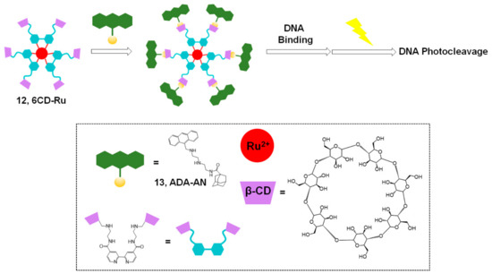 In 2018, Liu and coworkers reported enhanced DNA binding and photocleavage abilities using a supramolecular strategy with a Ru(II) complex (Figure 5) [35]. PDT is considered an efficient and safe treatment for cancer, and several ruthenium complexes, including inorganic Ru(II), organometallic Ru(II) complexes, nanomaterial Ru(II), and Ru(II) polypyridine complexes, have been extensively studied for PDT [36]. In this system, a combination of hexa-β-cyclodextrin (CD)-appended Ru(II) complex (12, 6CD-Ru) and adamantane-modified anthracene (13, ADA-AN) was used for host–guest chemistry and the self-assembly to a supramolecular complex. This supramolecular complex was found to have non-covalent binding properties required for DNA photocleavage and enhanced efficiency owing to the six anthracene groups per Ru(II) complex. Moreover, the CD-based complex exhibited good water solubility. Therefore, efficient and enhanced photocleavage ability and antitumor activity of the Ru(II) complexes were achieved using the 6CD-Ru and ADA-AN systems under aqueous conditions with photoirradiation. These results suggest a new model that could be constructed for efficient PDT using visible light.