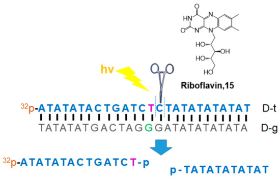 Selective DNA cleavage and tumor cell death were studied by Wang, Jiang, and Tang in 2017 using riboflavin (15, vitamin B2) irradiation (Figure 7) [39]. Riboflavin is an essential natural photosensitizer and a key molecule for redox chemistry in enzyme activity. Therefore, riboflavin is considered a promising anticancer agent for PDT. Based on their previous report showing sequence-specific photocleavage of RNA using riboflavin [40], Tang et al. revealed the recognition of riboflavin to G–T mismatch in DNA. It has been reported that several solid tumors are missing DNA mismatch repair (MMR) pathways; therefore, tumor cells generally have more G–T mismatches than normal cells in their DNA. In this system, riboflavin recognizes G–T base pairs, and singlet oxygen is generated through interaction with mismatched DNA for photocleavage of the neighboring nucleotides. This riboflavin system has several advantages for the photocleavage of DNA: (1) riboflavin is the most effective natural photosensitizer, (2) MMR deficiency can be solved in a short time, (3) low cytotoxicity, (4) essential nutrients for eukaryotic cell absorption, and (5) cell-specific activity could be monitored using this riboflavin system. Although the detailed mechanism of the riboflavin system has not been fully elucidated, it can provide an efficient PDT method for tumor cells. Types of photosensitizers for nucleic acid strand photocleavage and their properties are summarized in Table 1. Other compounds, such as naphthalimides, coronene, 2-quinolinium dicarbocyanine, and Fe(II)N4Py, were introduced to visible light-induced photocleavage of DNA strands [41,42,43,44,45,46].