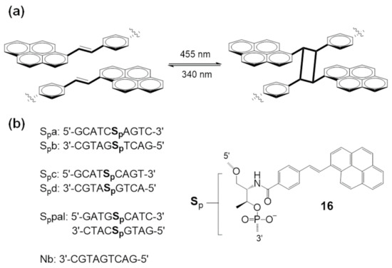 To overcome the limitations of systems based on UV irradiation, [2 + 2] photocycloadditions proceeding with visible light have been developed. In 2016, Asanuma et al. reported visible light-triggered photo-cross-linking of a DNA duplex via reversible [2 + 2] photocycloaddition using a styrylpyrene moiety (16, Sp) [61]. This [2 + 2] photocycloaddition of styrylpyrene is well-established (Figure 8a).