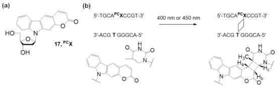 Artificial oligonucleotides which have the pyranocarbazole nucleoside PCX (17) have demonstrated photo-cross-linking properties, and pyranocarbazole could form a [2 + 2] cycloadduct with its complementary strand of over 90% with thymine and 20% with cytosine under 400 nm light for 10 s.