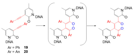 Apart from advances in [2 + 2] photocycloaddition, other types of visible light photo-cross-linking methods have recently been designed. One of the representative works was performed by Onizuka et al. This group developed alkyne–alkyne photo-cross-linking based on base-flipping [64] to induce the flipping-out structure of oligonucleotides, 3-arylethynyl-5-methyl-2-pyridone nucleosides, which contain a phenyl (19) or an anthracenyl moiety (20) (Figure 11). In the base flipping-out field, two alkynes overlap with each other, and the [2 + 2 + 2] cycloaddition reaction proceed with the alkynes and molecular oxygen to form a 1,4-enedione structure through the single electron transfer (SET) mechanism. By using nucleosides containing an anthracenyl moiety, cross-linking products were readily obtained in 1 min using visible light at a wavelength of 440 nm.