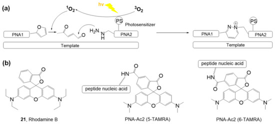 (a) Photo-triggered ligation of PNA strands by utilizing photoexcited singlet oxygen. (b) Structure of rhodamine B (photosensitizer) and photosensitizer-containing nucleotides. Chem. Sci. 2020, 11, 11729–11739, doi:10.1039/d0sc04875e—Reproduced by permission of The Royal Society of Chemistry [65].