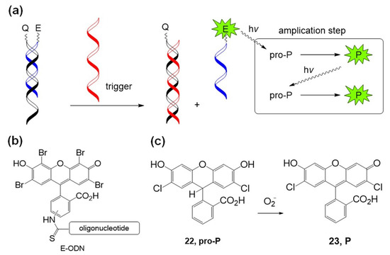 Mokhir et al. developed several fluorogenic photochemical reactions using molecular oxygen activation. In 2011, an autocatalytic photochemical reaction was developed using an eosin photosensitizer containing an oligonucleotide and a pro-photosensitizer [72]. Figure 13 shows the autocatalytic photochemical reaction. First, eosin–oligonucleotide E–ODN was combined with a complementary quencher containing oligonucleotide Q–ODN. In the presence of a trigger oligonucleotide that has higher affinity with quencher–oligonucleotide Q–ODN than with photosensitizer–oligonucleotide E–ODN, free eosin–oligonucleotide E–ODN is released and starts its photochemical reaction under green light irradiation. Photoexcited eosin generates singlet oxygen (1O2) and superoxide anion radical (O2•−), and the anion radical drives the autocatalytic photochemical oxidation of pro-photosensitizer pro-P (22, pro-2′,7′-dichlorofluorescin) to produce colored and fluorescent products, P (23).