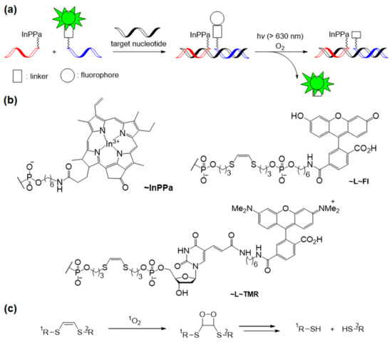 In 2012, Mokhir et al. reported a new fluorogenic probe for specific nucleic acid templates by releasing fluorescent dyes under safe red light (635 nm) irradiation [73]. One probe has a photosensitizer located at the 3′-terminus of the oligonucleotide backbone. The other oligonucleotide probe contains a fluorophore linked with a cleavable linker (L~Fl or L-TMR) at the 5′-terminus (Figure 14a,b). This system uses In3+(pyropheophorbide-a) chloride (InPPa) as a photosensitizer and 1O2-sensitive -SCH=CHS- linker to cleave the fluorophore and oligonucleotide backbone (Figure 14c).