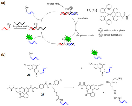 Winssinger et al. focused on the Ru-catalyzed photoreduction of nucleic acid-templated fluorophore uncaging reactions. In 2012, the first nucleotide-templated photoreduction of an azido-pro-fluorophore probe was performed using a catalytic Ru-containing peptide nucleic acid probe [76,77]. Azido-pro-fluorophore, azido-coumarin (26), or azido-rhodamine (27) was used, and the reduction toward amine was required to turn on the fluorophore function. The Staudinger reaction is a well-known process for the reaction of azide into amines, and several biological applications have been reported [78,79]. However, the Staudinger reaction requires excess phosphine probe due to phosphine’s sensitivity to oxidation. Photocatalytic reduction of azide with [Ru(bpy)3]2+ in the presence of a stoichiometric reductant, for example, ascorbate or NADPH (nicotinamide adenine dinucleotide phosphate), was developed in 2011 by Liu et al. [80] and this methodology was applied to nucleic acid-templated reactions (Figure 16a). [Ru(bpy)2phen]2+-tethered photosensitizer probe was synthesized from the commercially available [Ru(bpy)2(5-NCSphen)]2+ complex (25). The desired photoreaction occurred with a 2% loading of the Ru-photosensitizer probe under 455 nm light irradiation on a 10 nM matching complimentary template.