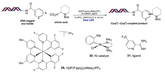 In 2019, water- and DNA-compatible decarboxylative arylation using α-amino acids and aryl halides conjugated with DNA was established by the same group [94]. In this work, dual catalysis using Ir and Ni(0) invented by MacMillan and Doyle [95] was introduced onto DELT DNA strands. The optimized reaction was observed when the Ir photocatalyst (29, Ir[dF(F)ppy]2(dtbbpy)PF6), air-stable nickel pre-catalyst (30), and electron-deficient pyridyl carboxamidine ligand (31) were used (Figure 19). The reaction proceeded well with various α-amino acids (N-BOC-protected α-amino acids, cyclic and bicyclic amino acids) and aryl halide pairs with moderate to high yields. Finally, the potential reaction for the DELT was successfully demonstrated by parallel synthesis performed in a 96-well plate with a blue LED array.