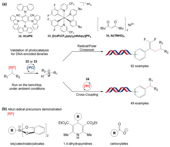 (a) DNA-encoded library synthesis based on cross-coupling based on Ni/photoredox dual catalysis and photoredox-catalyzed radical/polar crossover. (b) Structure of alkyl radical precursors in this study. Adapted with permission from J. Am. Chem. Soc. 2019, 141, 3723−3732, doi:10.1021/jacs.9b00669. Copyright (2021) American Chemical Society [97].