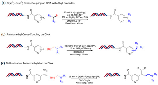One year later, Molander and coworkers developed three approaches to expand the reaction scope of Ni/photoredox that uses α-amino acids and DHP [98]. The first approach is reductive C(sp2)−C(sp3) coupling of primary or secondary alkyl bromides to DNA-tagged aryl halides (bromides and iodides), and the best result was obtained with [Ir(dtbbpy)(ppy)2]PF6 (Figure 21a). Using the same catalyst, aminomethyl cross-coupling of (hetero)aryl halide and α-silylamines was performed on DNA as the second approach. Alpha-silylamines are thought to be oxidized by [Ir[dFCF3ppy]2(bpy)]PF6 to yield α-aminomethyl radicals, which led to a coupled reaction mediated by the nickel catalyst (Figure 21b). Finally, α-silylamines were also applied to radical/polar crossover defluorinative alkylation (Figure 21c). All three approaches used in the study showed reaction completion within minutes and had high functional group tolerance. These reactions are expected to enable derivatization of diverse chemical compounds for a large number of DNA-encoded libraries.