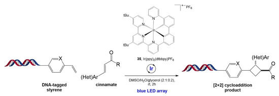 Very recently, inspired by previous studies regarding [2 + 2] cycloaddition [99,100], Kӧlmel and co-workers developed a [2 + 2] cycloaddition reaction for cyclobutane formation catalyzed by an iridium-based photocatalyst, Ir(ppy)2(dtbbpy)PF6 (35) (Figure 22) [101]. The cycloaddition reaction was carried out using a DNA-tagged styrene and a cinnamate substrate. The mechanism involves the formation of a cinnamate triplet state arising from triplet energy transfer from the Ir photocatalyst to the cinnamate, followed by an intramolecular radical−radical combination of the 1,4-diradical intermediate generated from the formation of the C(sp3)−C(sp3) bond between the cinnamate triplet state and the styrene. The reaction is well-tolerated by the variation in substituents on the aromatic ring, types of carboxylic derivatives of the enone substrate, and types of styrene derivatives, demonstrating excellent functional group tolerance. This [2 + 2] cycloaddition was further applied to prepare three-cycle DNA-encoded libraries containing a unique cyclobutane ring in the middle, achieved by three-step functionalization: amide coupling, [2 + 2] cycloaddition, and amide coupling or reductive amination.
