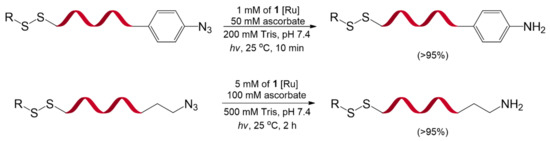 Azide reduction catalyzed by Ru(II) complexes (1) and visible light was first developed by Liu et al. in 2011 [80] (Figure 23). The reaction showed high chemoselectivity over many functional groups, including alcohols, phenols, acids, alkenes, alkynes, aldehydes, alkyl halides, alkyl mesylates, and disulfides. Moreover, owing to its mild conditions and biocompatibility, this reaction was introduced into nucleic acids, protein enzymes, and oligosaccharides. Such remarkable properties of the reaction could potentially be used for the DELT.