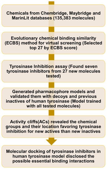 Tyrosinase is an essential enzyme in melanin synthesis, contributing to pigmentation in mammals [1]. Tyrosinase catalyzes the hydroxylation of l-tyrosine to l-DOPA, which is the first step in melanogenesis [1]. Further, l-DOPA is oxidized by tyrosinase to dopaquinone in the melanin synthesis pathway [1]. The tyrosinase-related proteins (TRPs) are also important in melanin synthesis through a few reactions, and their active site contains two Zn2+ ions unlike two Cu ions in tyrosinase [1,2]. Tyrosinase also causes browning in food products, which damages the appearance in fruits and vegetables, after it oxidizes the phenolic substrates during various handling processes in the food industry [3,4]. Thus, tyrosinase inhibitors can have industrial applications such as skin-whitening [5] and antibrowning agents [3]. A variety of natural or synthetic tyrosinase inhibitors have been reported, but effectiveness in clinical trials are yet to be confirmed for many of them [6,7]). Thus, researchers continue to adopt several in vitro and in silico procedures to identify clinically effective tyrosinase inhibitors and try to fulfill the industrial demands [6]. In this study, we applied chemical similarity-based virtual screening (VS) to select the candidates for tyrosinase inhibitors by using evolutionary chemical binding similarity (ECBS) [8], a machine learning-based similarity model recently developed by our group.