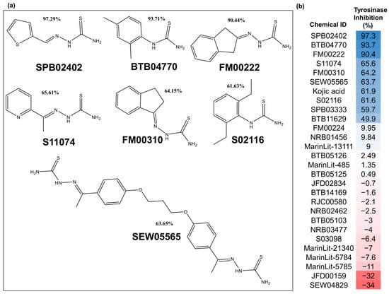 (a) Two-dimensional structures of the newly identified tyrosinase inhibitors found in the present study. (b) The relative tyrosinase inhibitory activities for 27 chemical compounds (1 mM) tested through the tyrosinase inhibition assay are shown. The tyrosinase inhibition percentage values are represented by a color gradient from blue (highest) to red (lowest).