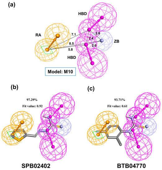 The tyrosinase pharmacophore model M10 mapped to the two representative inhibitors. (a) The common feature pharmacophore model M10 generated using chemicals tested in our study. The interfeature distances are given in angstroms. Hydrogen bond donor (HBD), ring aromatic (RA), and zinc binder (ZB) are the features extracted from chemicals. (b) SPB02402 and (c) BTB04770 mapped to the pharmacophore model M10. Their tyrosinase inhibition percentages and pharmacophore fit values are given.
