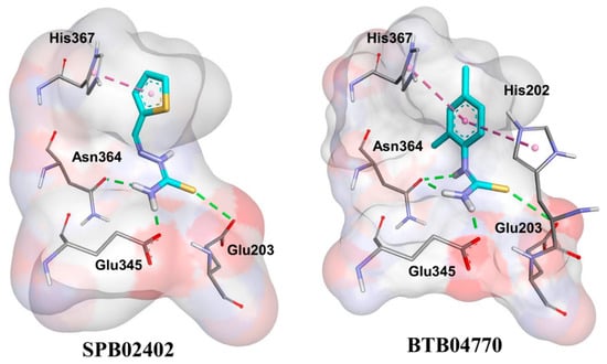 From the docking results of 1000 poses, we sorted the lowest energy conformation in the cluster with a high number of poses. We obtained the docking poses for two tyrosinase inhibitors that structurally represent all the new actives (Figure 4). As expected, pi–pi interaction with His367 was conserved among the inhibitors. In addition, the polar interactions with Asn364, Glu345, and Glu203 were conserved. For BTB04770 and similar structures, His202 might play a key role in tyrosinase inhibition. The autodock binding energy for the BTB04770 and SPB02402 were −5.06 and −4.78 kcal/mol, respectively.