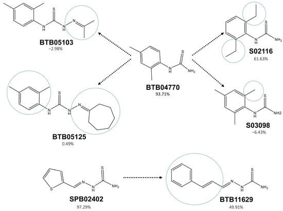 Activity cliffs of the molecules tested in the tyrosinase inhibition assay are presented. The tyrosinase inhibition activities of the two representative chemicals (BTB04770 and SPB02402) are compared with the other chemicals in terms of their activity changes. The blue dotted circles exhibit the structural difference(s) between the molecules. The tyrosinase inhibition percentage of every molecule is given.