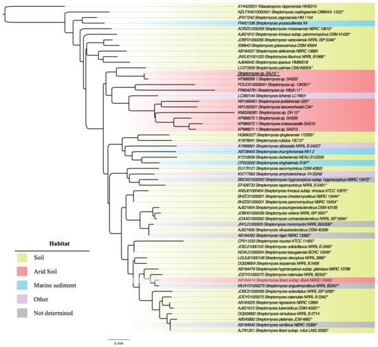Streptomyces phylogenetic tree based on 16S rRNA gene sequence. SAJ15 forms a monophyletic clade with the desert isolate SAS02. Most of the Streptomyces isolated from arid-soil form a clade taxonomically near to SAJ15. Kitasatospora nipponensis HKI 0315 was used as an outgroup. Habitats for each Streptomyces isolates are indicated with colored bullets. Genome assembly availability is marked with an asterisk.