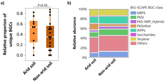 Bacterial strains isolated from harsh environments, such as arid soils, have been described as a rich source of novel specialized compounds []. To explore if arid environments harbor a higher number of unique BGCs in Streptomyces, their relative proportion was analyzed among the genome assemblies of Streptomyces reported from arid and non-arid environments (Figure 3). The relative proportion of unique BGCs is similar (Welch’s test, P = 0.45) in both arid- and non-arid-based Streptomyces (Figure 3a); however, relative abundance of different BGC classes differed in arid Streptomyces from non-arid counterparts (Likelihood-ratio test, χ2 = 16.68, P = 0.0195). Notably, occurrence of NRPS declined, with the notable increase in “PKS-Other” and terpene BGCs (Figure 3b). The specific enrichment of certain BCGs is in line with the growing observations on endemicity of microbial communities and functionalities in the desert ecosystems [,].