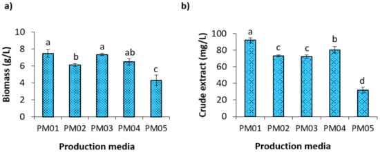 Effect of different production media (PM01 to 5, Table S4) on growth of (a) secondary metabolite production (b) in Streptomyces sp. SAJ15. Growth was measured as dry mycelial biomass in g L−1. Crude extracts were obtained using the standard liquid–liquid extraction method and expressed in mg L−1 (Mean ± SD). Different lowercase letters across denote statistically significant differences (p < 0.05 level).