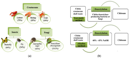 Chitosan is derived from chitin, usually obtained from natural sources such as the residues of shrimp, crab and lobster, fungal mycelia and green algae [15,31,32]. This biopolymer can also be found in the exoskeletons of insects and fungal cell walls, as shown in Figure 1a. Chitin content in fungi varies between 19% and 42%, compared to the exoskeleton, where chitin can reach up to 75% [29,33]. Not all shellfish wastes are good sources of chitin. The blue crab (Callinectes) contains 14% of chitin, while oyster and clam shells have chitin content in the range of 4–6% [29,34]. Chitin content can vary with the proportion of minerals, proteins, and carotenoids, depending on the species, reproductive cycle phase, nutritional status, age, and also the peeling conditions during the processing [13,17]. Chitosan can be obtained by deacetylation of chitin through enzymatic or alkaline methods (Figure 1b). However, the enzymatic method has been limited only to the laboratory scale, while the alkaline method has been more widely used on an industrial scale, due to its short processing time, simplicity, and low operational costs [29].