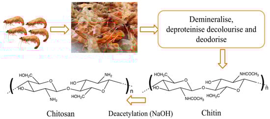 Chitosan is obtained by deacetylation of chitin in 40–45% sodium hydroxide, as shown in the sketch of Figure 2. The alkaline treatments hydrolyse the acetyl groups and transform the N–acetyl–d–glucosamine units into d–glucosamine units with free NH2 groups [15]. Chitosan, with different degrees of deacetylation, is generated depending on the reaction temperature, time, and concentration of the alkaline solution [43]. An additional purification step can be performed to obtain high purity chitosan. For this, the deacetylated product is dissolved in acid, centrifuged or filtered, and the chitosan is precipitated through the addition of alkali generating pure chitosan (90–95%) in paste form. These steps can be repeated to obtain higher purity chitosan (purity >99.9%) [15,23].