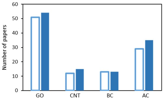 Number of papers published in 2019 (open) and 2020 (solid) focussed on various CS/carbon-based materials, where the carbon materials are graphene oxide (GO), carbon nanotubes (CNT), biochar (BC) and activated carbon (AC). All data taken from Scopus.