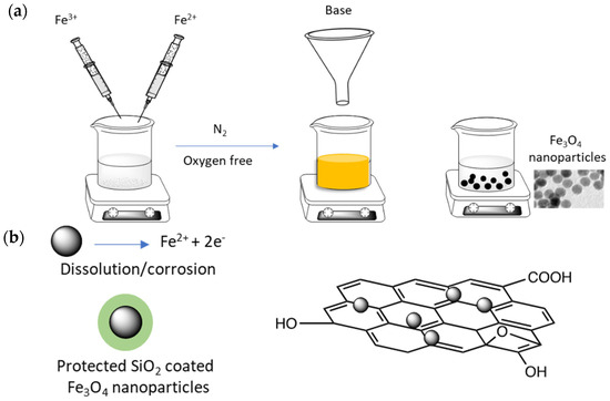 (a) Schematic representation of the co-precipitation method used to prepare Fe3O4 (b) SiO2 coated Fe3O4 nanoparticles deposited and dispersed on GO.