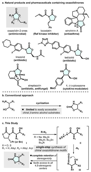 Functionalized oxazolidin-2-ones are among the most interesting heterocyclic compounds, with uses both as pharmaceuticals and as key synthetic intermediates (Scheme 1a). Since the seminal discovery of anti-bacterial activity of certain oxazolidin-2-ones by EI DuPont de Nemours and Co., Inc. in 1987 [1], the synthesis of substituted oxazolidin-2-one motifs has drawn a considerable amount of interest from the synthetic community [2,3]. These functionalized oxazolidin-2-one compounds have demonstrated a wide spectrum of pharmacological properties [4,5,6]. For instance, linezolid (LZD), the first synthetic oxazolidin-2-one antimicrobial agent, has shown potent efficacy against Gram-positive bacteria through the inhibition of bacterial protein synthesis [7,8]. LZD was approved by the FDA for the treatment of a range of traditionally drug-resistant infections, including MRSA and drug-resistant tuberculosis in 2002 [9]. Tedizolid is also a promising antibacterial agent that is used to treat skin infection in adults [10]. Thanks for these pharmacological properties, structurally diverse oxazolidin-2-one motifs often serve as key synthetic intermediates within the context of macrolide antibiotics syntheses. Additionally, these cyclic carbamate moieties are one of the most significant and widely utilized chiral auxiliaries in the realm of organic synthesis [11,12,13].