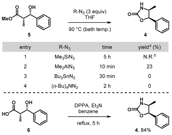 In order to test this hypothesis, syn-aldol adduct 3a was prepared as a model substrate by employing an Evans type auxiliary-mediated aldol protocol [11,24,25,26] following the procedure described by Crimmins [27,28,29] (Scheme 2). Initially, we attempted the direct nucleophilic azidation/Curtius reaction by treatment of 3a with Bu3SnN3 (3 equiv., THF, 90 °C). To our disappointment, the reaction only produced a trace amount (less than 2%) of product 4 (entry 1). Introducing an oxazolidinethione in syn-aldol product 3b and ensuing subjection in the nucleophilic azide transfer/Curtius reaction improved the yield, but only to 13% (entry 2).