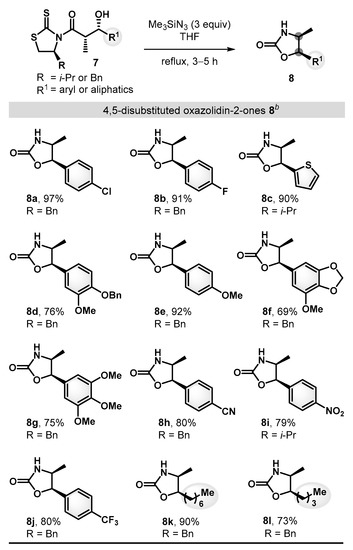 These low conversions could be attributed to the inherent electrophilic nature of C1 carbonyl carbon in 3a–c and the associated inhibition of the initial acyl azide formation. Therefore, we envisioned that corresponding aldol precursors with diminished electrophilicity at C1 in auxiliaries would potentially be more productive than oxazolidinones or oxazolidinethiones in establishing more effective construction of the oxazolidin-2-ones [29,30]. Consistent with our expectation, the nucleophilic azidation/Curtius reaction of thiazolidinethione 3c under the same reaction conditions (Bu3SnN3, THF, 90 °C) proceeded to provide corresponding oxazolidin-2-one 4 in higher conversion (57%).