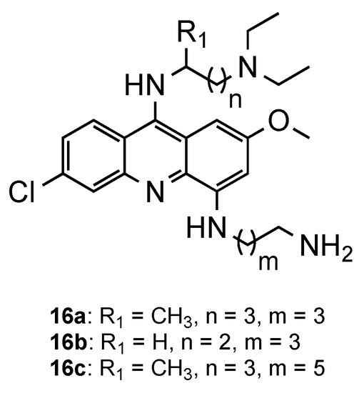 Recently, Fonte et al. developed QN derivatives through the introduction of a like PQ-side chain in position 4 of the acridine ring (Figure 10) towards multi-stage antimalarial drugs [21]. After the establishment of the synthetic route of these derivatives [22], the series of three compounds, with different side-chain length, were evaluated for their antimalarial activity against CQS 3D7 and CQR Pf W1 strains, and the hepatic stages of P. berghei. Overall, all the compounds exhibited activity against both stages of the parasite life cycle. Due to the scarce number of compounds, it was not possible to assess a solid structure–activity relationship. However, the results confirmed the importance of the aminoalkyl chain in position 9 of the acridine ring in the blood antimalarial activity (16a–c, 3D7: 0.26 µM < IC50 < 0.68 µM; W2: 0.49 µM < IC50 < 6.17 µM), when compared to the corresponding analogues lacking this side chain (3D7: IC50 > 5.64 µM; W2: 2.39 µM < IC50 < 5.14 µM). Regarding liver-stage activity, compound 16a was significantly active at 10 μM (IC50 = 11.02 µM), although the other derivatives were highly cytotoxic towards Huh-7 cells at this concentration. Remarkably, none of the compounds was hemolytic up to 10 µM [21].
