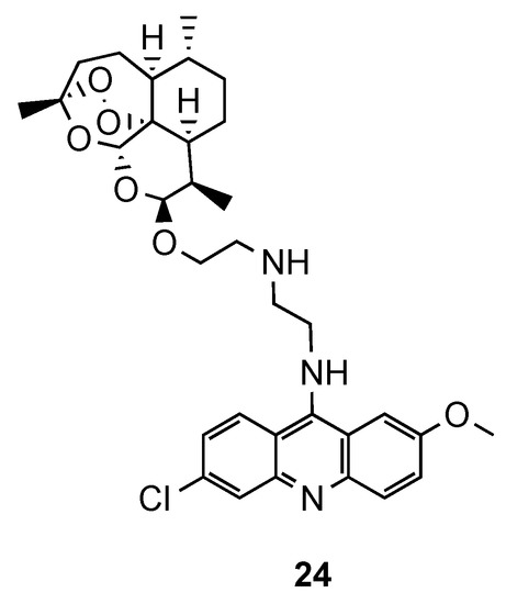 In the same line of thought, Joubert et al. reported the synthesis and in vitro antimalarial activity of hybrids obtained by covalently linking artemisinin and acridine pharmacophores through an aminoethyl ether linker [34]. Most of the compounds were shown to be more active than the reference CQ, but less than the references dihydroartemisinin (DHA) and artesunate against CQS and CQR Pf strains. Hybrid 24 (Figure 16), which contains ehtylenediamine as a linker, was the most promising antimalarial compound with 7-fold higher antimalarial potency than CQ against both strains, along with a high selectivity index towards the parasitic cells (24: IC50(NF54) = 2.6 nM; IC50(Dd2) = 35.3 nM; CQ: IC50(NF54) = 18.5 nM; IC50(Dd2) = 271.7 nM; SI = 615). It is noteworthy that the hybrids possessed generally higher activity than their precursor 9-aminoacridines and less cytotoxic for human cells than DHA [34].