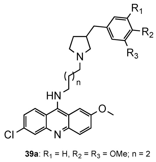 Considering the recent reports of resistance to ACT [3], Pandey et al. [55] developed a series of pyrrolidinoaminoalkane–acridine hybrids (39, Figure 25) to posteriorly use them as potential partners with artemisinin derivatives for the ACT. The two points of structural variations were the phenyl ring and the alkane spacer. When evaluated against the CQS 3D7 and the CQR K1 strains, compound 39a performed better (39a: IC50 (3D7) = 9.3 nM, IC50 (K1) = 5.2 nM). Then, 39a was evaluated in vivo in Swiss mice infected with the MDR strain P. yoelii nigeriensis at a dose of 100 mg/kg per day for 4 days via the oral route, showing > 90% suppression of parasitaemia on day 4. The authors further showed that, when tested in combination with artemether, arteether or artesunate, compound 39a serves as a good partner in ACT, namely, with artemether [55].