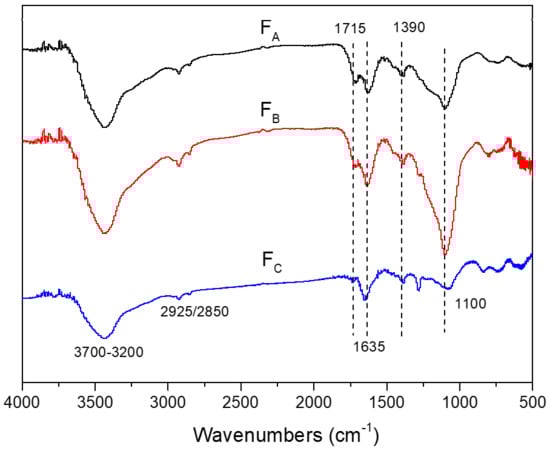 Figure 1 illustrates the fourier transform infrared (FTIR) spectra of HA fractions (FA, FB and FC). Generally, the spectra of HA fractions show the following bands: OH stretching vibration absorption at 3700–3200 cm−1, C-H stretching vibration absorption of aliphatic series at 2925/2850 cm−1, carbonyl C=O, aromatic C=C, hydrogen-bonded C=O, or COO asymmetrical stretch absorption around 1635/1715 cm−1, the symmetric COO band at 1390 cm−1, and C−O stretching vibration of phenol, alcohols, ethers and/or polysaccharides around 1100 cm−1 [,]. The relative peak intensities, which reflected the relative amount of each functional group, were different in the spectra of three fractions, indicating their different structural characteristics. Compared with FC, FA and FB showed relatively more intense bands at 1715, 1635, 1390 and 1100 cm−1, indicating that FA and FB contained high abundance of aromatic contents, carboxyl and phenolic functional groups.