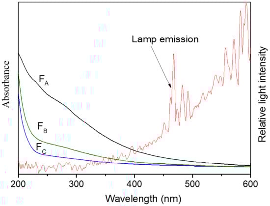 The UV-vis absorption spectra of FA, FB and FC and the lamp emission are presented in Figure 2. The absorption of the three HA fractions varied greatly and their absorption order was FA> FB > FC. Korshin et al. reported that a band corresponding to absorption around λ 250 nm designated π-π* transitions in the substituted benzenes or polyphenols []. Therefore, the specific-UV absorbance at 254 nm (SUVA254) was commonly correlated with the HA aromaticity [,]. In addition, the E253/E203 ratio was often used to characterize the type of the substituent groups on aromatic rings []. A low E253/E203 ratio indicates that the substituent groups on aromatic rings are mainly non-polar functional groups such as aliphatic groups, whereas a high E253/E203 ratio suggests that the main substituent groups on aromatic rings are polar functional groups such as hydroxyl, carboxyl, carbonyl and ester groups [,]. SUVA254 and E253/E203 of the three fractions are listed in Table 1. The order of SUVA254 is FA > FB > FC, indicating that FA contains a relatively high amount of benzenoid and aromatic C=C groups compared with FB and FC. Moreover, E253/E203 of FA was apparently higher than FB, and FC showed the lowest E253/E203 ratio. These results were well in agreement with the information provided by FTIR that FA and FB contained more aromatic components, and FA contained more polar functional groups on its aromatic rings, such as carboxyl.