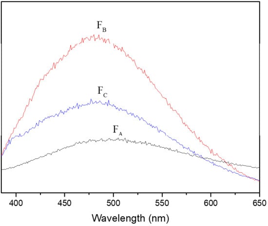Fluorescence spectroscopy has been widely used to characterize DOM in water and soil [,,]. The fluorescence emission spectra of the HA fractions are shown in Figure 3. The λex/λem of FA was 360/502 nm with a low intensity, while the λex/λem of FB and FC was lower, at about 360/480 nm. The long wavelength and low intensity measured for the fluorescence peak of FA indicates the presence of higher amounts of condensed aromatic rings and electron-withdrawing groups (e.g., carboxylic groups) relative to FB and FC. On the contrary, the short wavelength and high intensity measured for FB were associated with the low aromatic content and high electron-donating groups, such as the hydroxyl group [].