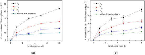 The generation of bromophenols in bromide solutions containing different HA fractions under simulated sunlight irradiation are shown in Figure 4. The concentration of bromide, [Br−], in seawater is at an average concentration of 0.8 mmol L−1, while it is enriched in the sea-spray aerosols due to the evaporation of water and can reach dozens of mmol L−1 []. Considering the wide [Br−] range in seawater and aerosol, the bromination of phenol was investigated in the presence of 8 mmol L−1 Br− in this study. The initial phenol concentration is 2 mg L−1, and the concentration of HA fractions is 6.3 mgC L−1. Phenol was irradiated in the reaction solutions and formed two brominated derivatives, 2-bromophenol and 4-bromophenol. The fractions with high aromatic contents and polarity, FA and FB, enhanced phenol bromination obviously, and the promotion effects of each fraction on the photo-bromination of phenol varied in the order of FA > FB > FC.