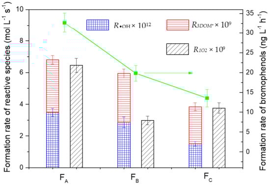 The aromaticity and polarity of DOM fractions could influence the property of DOM microenvironment. Although the relationship between DOM composition and the oxidizing ability of 3DOM* is not known yet, it has been reported that some DOM proxies, such as anthraquinone-2-sulphonate, possess a powerful triplet oxidant to be 2.28 VNHE []. Thus, it can be supposed that aromatic fractions (FA and FB) may have a relatively stronger oxidizing ability of 3DOM* due to the possible existence of aromatic ketones structures. In addition, the π-π complexes of DOM and phenolic compounds were supposed to impact their photochemical reaction []. It has been demonstrated that π-π electron donor-acceptor interactions played an important role between π-donor aromatic compounds and π-acceptor DOM, since DOM contains lots of potentially strong π-acceptor groups, such as quinones and aromatic rings substituted with electro-withdrawing groups such as carbonyl and carboxyl []. FTIR spectra demonstrated that FA possessed more aromatic C=C contents, and UV-vis absorbance (E253/E203) demonstrated that FA contained more polar groups, such as carboxyl, on aromatic rings. Therefore, the higher aromatic and stronger polar FA was a stronger π-acceptor than FB and FC. It is supposed that FA and phenol formed stronger complexes than FB and FC, which provided a better microenvironment for phenol reaction with reactive species (including both ROS and RBS) to generate bromophenols.