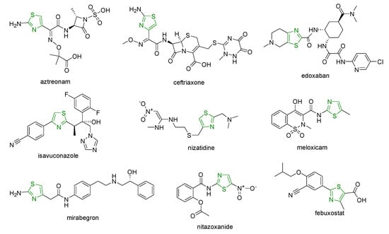 Several drugs such as sulfathiazole; aztreonam; numerous cephems (ceftaroline, cefotiam, ceftibuten, cefixime, ceftriaxone, cefotaxime, ceftazidime, cefmenoxime, ceftizoxime, cefepime, cefdinir) with antibacterial effects; pramipexole with antiparkinsonian activity; edoxaban with antithrombotic effects; isavuconazole with antifungal effects; famotidine and nizatidine with antiulcer activity; meloxicam with anti-inflammatory effects; tiazofurin, dabrafenib, dasatinib, ixabepilone, and epothilone with antitumor effects; mirabegron as a β3-adrenergic receptor agonist; nitazoxanide and thiabendazole with antiparasitic effects; and febuxostat with antigout activity contain one thiazole moiety in the structure (Figure 1) [2,3,4].