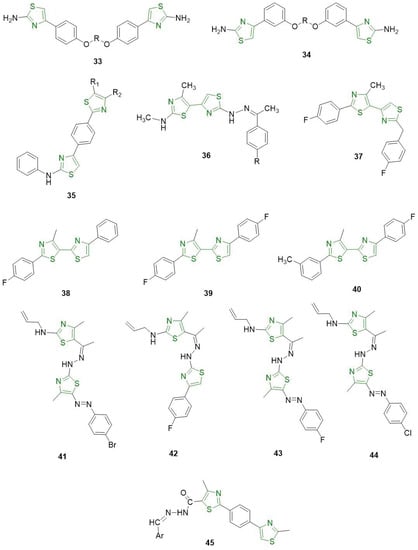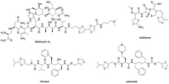 Compounds bearing two thiazole rings, such as the antitumor drug bleomycin, the antiretroviral agent ritonavir, the pharmacokinetic enhancer for HIV drugs cobicistat, and the antibacterial agent cefditoren, have been authorized on the pharmaceutical market (Figure 2) [2,5].