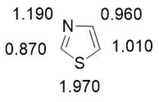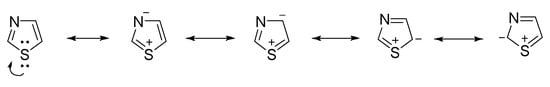 Free thiazole is a pale-yellow flammable liquid, with a pyridine-like odor and a boiling point in the range of 116–118 °C. It has an aromatic character, due to the delocalization of a lone pair of electrons from the sulfur atom, resulting in a 6π-electron system. Also, its high aromaticity is highlighted by proton nuclear magnetic resonance, the chemical shift values of each proton within the thiazole ring being situated between 7.27 and 8.77 ppm. The resonance structures of thiazole are illustrated in Figure 3 [28,29].