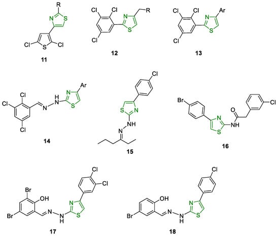 A new series of 2,5-dichloro thienyl-substituted thiazoles were efficiently obtained by Sarojini et al. [53] (compound 11, Figure 5) and their minimum inhibitory concentration (MIC) values against four fungal strains (Aspergillus fumigatus, Aspergillus flavus, Penicillium marneffei, and Trichophyton mentagrophytes) and four bacterial strains (Staphylococcus aureus, Escherichia coli, Klebsiella pneumoniae, and Pseudomonas aeruginosa) were determined. Compounds substituted with amino or 8-quinolinyl moieties exhibited enhanced antimicrobial activity with MIC values ranging between 6.25 and 12.5 µg/mL.