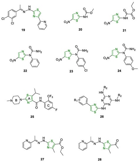 de Oliveira Filho et al. [61] synthesized 22 novel thiazole derivatives and investigated their anti-T. cruzi activity. Compound 19 (Figure 6) proved to be very potent against trypomastigotes of the Y strain, with an IC50 value equal to 0.37 µM, being nearly 28 times more active than benznidazole, used as a reference drug. It also reduced blood parasitemia in mice. Moreover, the new compounds possessed a good drug-likeness profile.